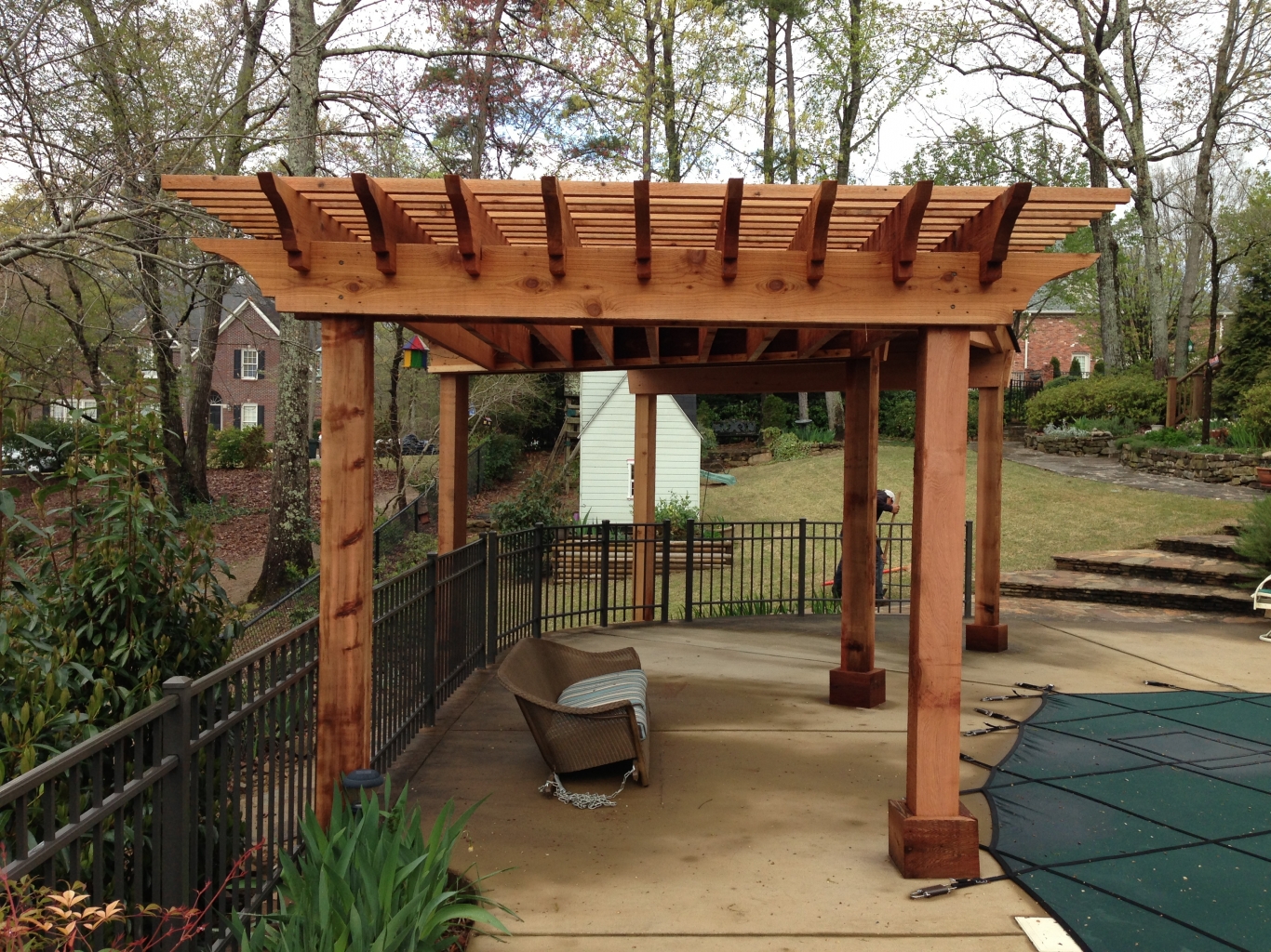 Looking to shelter your patio space further? We specialize in crafting custom roofed arbor structures tailored to your needs. These structures not only cover and protect your patio area but also serve as an ideal solution for seating spaces with outdoor TVs or dining tables. Moreover, our collaboration with certified professional electricians allows us to seamlessly install lighting and fans in the ceiling, enhancing both comfort and ambiance.